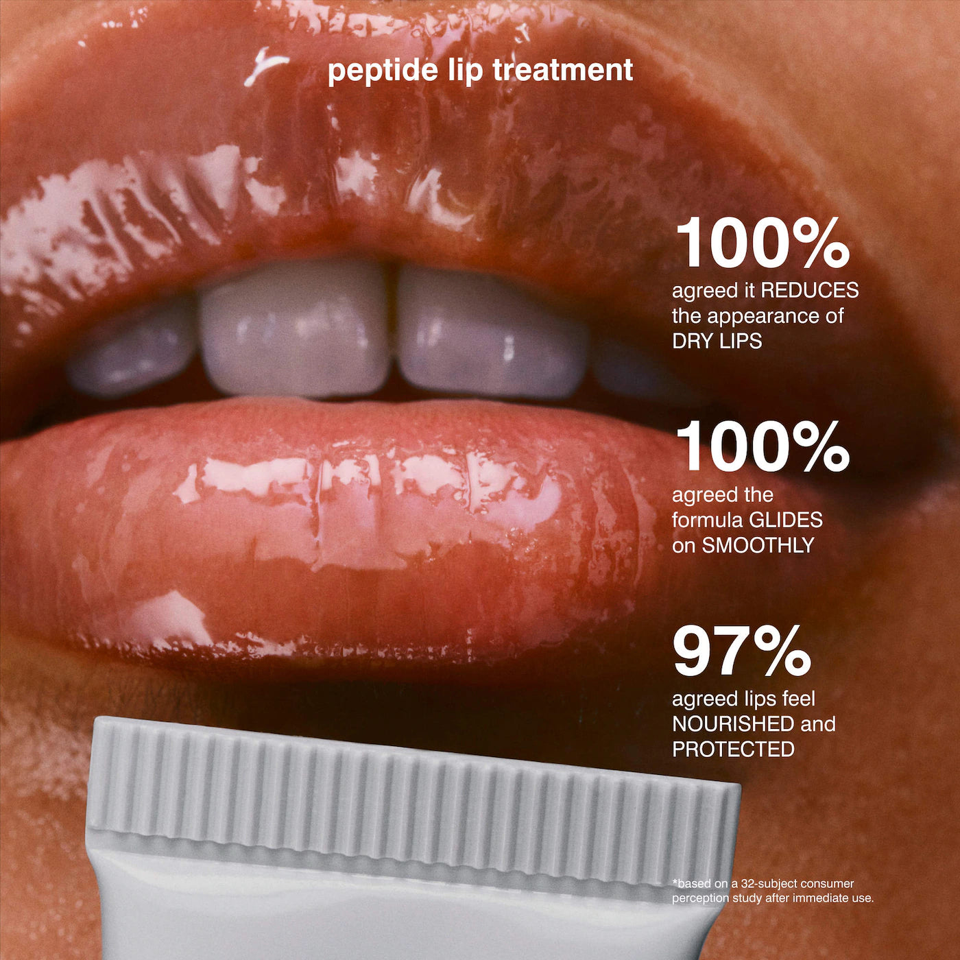 - Péptido (tratamiento y tinte para labios): hidrata, suaviza y rellena visiblemente los labios a la vez que reduce la apariencia de líneas finas.